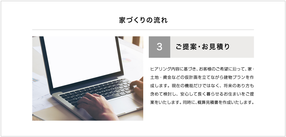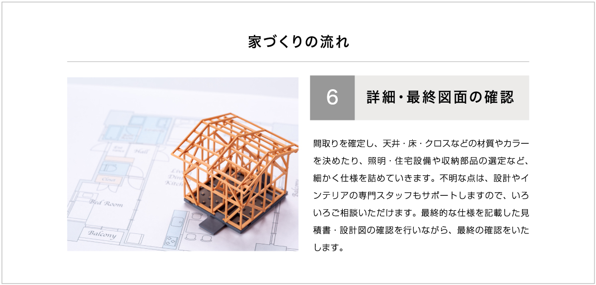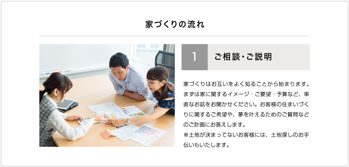 土地・間取り・デザイン…想いの全てをカタチにする。ご家族の想いをしっかりと伺い、プランニングやデザイン・施工管理だけでなく、土地探しから住宅ローンの手続き・各種補助金等の申請手続きまでしっかりと、家づくり全般を住宅のプロフェッショナルがサポートします。