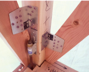 基礎から土台、土台から柱、柱から梁や桁、さらに棟まで耐震金物で部材をしっかりと固定します。