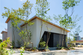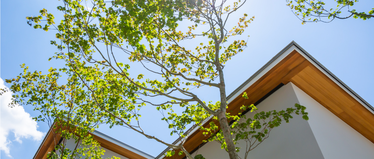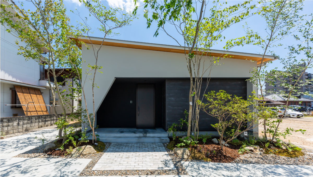 中庭を建物の中心に配置することで、色々なカタチの屋根が複合的に合わさり、平屋にありがちな単純なカタチとは程遠い立体的でスタイリッシュなデザインが生まれました。個性的な外観なのに、室内は落ち居着いた空間。このギャップにゲストの方もきっと驚かれるはずです。